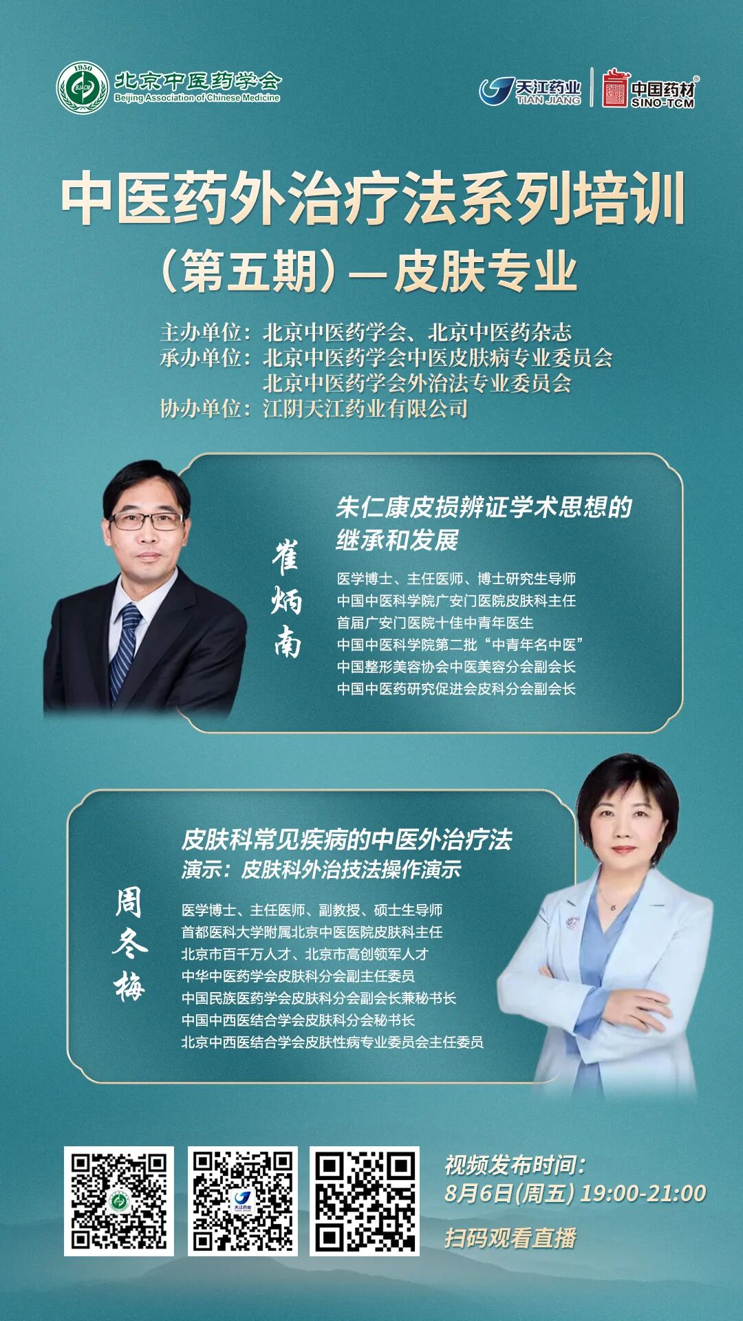 本期特邀请中国中医科学院广安门医院皮肤科崔炳南主任,首都医科大学附属北京中医医院皮肤科周冬梅主任,为我们亲授外治疗法在皮肤病中的应用。让我们相约8月6日(本周五)晚19点,不见不散!