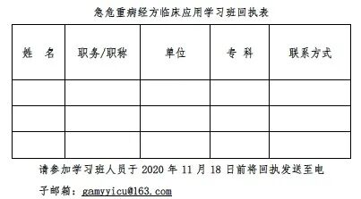 请有意参加人员填写报名回执,可通过发送电子邮件报名,请标注“急危重病经方临床应用学习班报名回执”字样。报名截止日期:2020年11月18日。邮箱地址:gamyyicu@163.com。