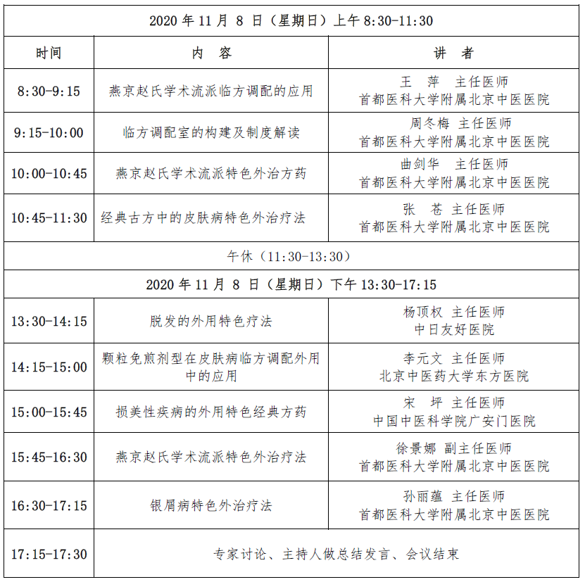 本次培训特邀国内皮肤病领域多位知名中医、西医及中西医结合专家进行授课,分享燕京赵氏学术流派临方调配的应用、临方调配室的构建及制度解读、燕京赵氏学术流派特色外治方药、经典古方中的皮肤病特色外治疗法、脱发的外用特色疗法及免煎颗粒的外治经验及临床心得,旨在提高中西医结合特色外治法的诊疗水平。挚邀请各位同道踊跃参加本次会议,现将相关事宜通知如下: