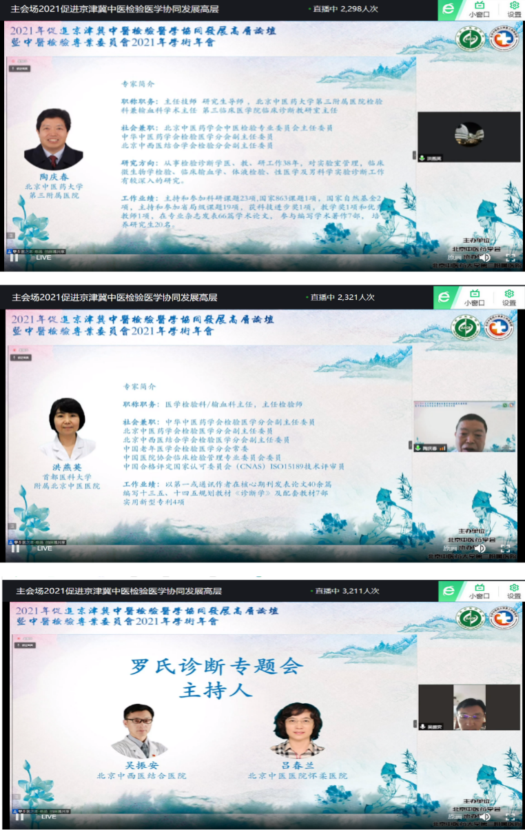 参加学术年会代表来自北京市二、三级医院,以及河北、天津等省市,在线参加人员近6000人,共有18位专家进行精彩讲座,参会学员学习国内外检验医学新进展,新成果,加强京津冀地区及附近城市中医、中西医结合医院、民族医院检验人员同道交流,促进中医检验医学的发展,更好服务于中医药事业发展,为健康中国贡献力量。