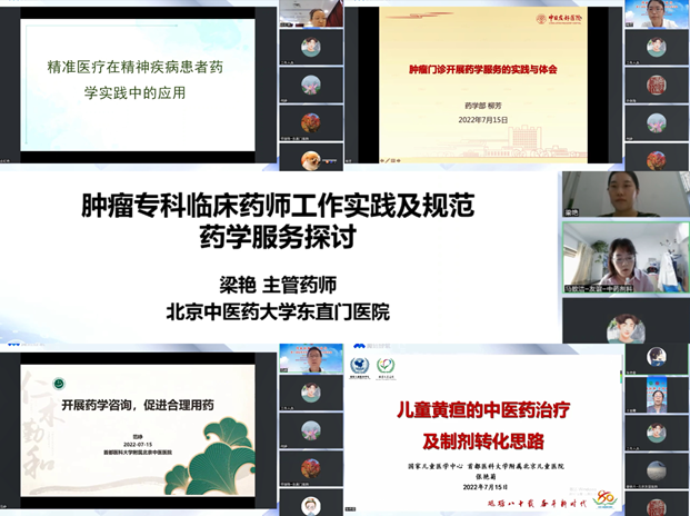 北京儿童医院张艳菊副主任药师介绍《儿童黄疸的中医药治疗及制剂转化思路》、中日友好医院柳芳副主任药师分享《中药临床药师在门诊开展药学服务的实践与体会》、北京中医药大学东直门医院梁艳主管药师介绍《肿瘤专科临床药师工作实践及规范药学服务探讨》、北京安定医院庄红艳副主任药师分享《精准医疗在精神疾病患者药学实践中的应用》、北京中医医院范峥副主任药师做《开展药学咨询,促进合理用药》主题报告。