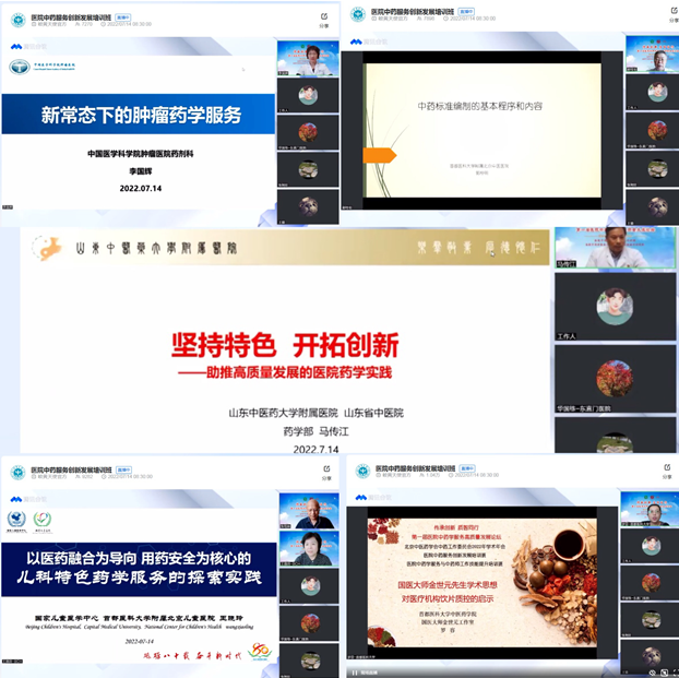 中国医学科学院肿瘤医院李国辉教授分享《抗肿瘤药物的风险管理与实践》、北京中医医院郭桂明教授介绍《中医药标准编制的基本程序和内容》、山东省中医院马传江教授分享《坚持特色 开拓创新——助推高质量发展的医院药学实践》、北京儿童医院王晓玲教授介绍《以医药融合为导向 用药安全为核心的儿科特色药学服务的探索实践》、首都医科大学罗容教授分享《国医大师金世元先生学术思想对医疗机构饮片质控的启示》。