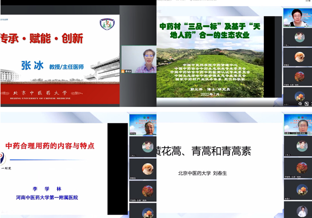 北京中医药大学张冰教授做题为《传承 赋能 创新》的报告,中国中医科学院资源中心郭兰萍教授分享《中药材“三品一标”及生态农业最新进展》、河南中医药大学第一附属医院李学林教授介绍《中药合理用药的内容与特点》、北京中医药大学刘春生教授做题为《黄花蒿、青蒿和青蒿素》的报告。