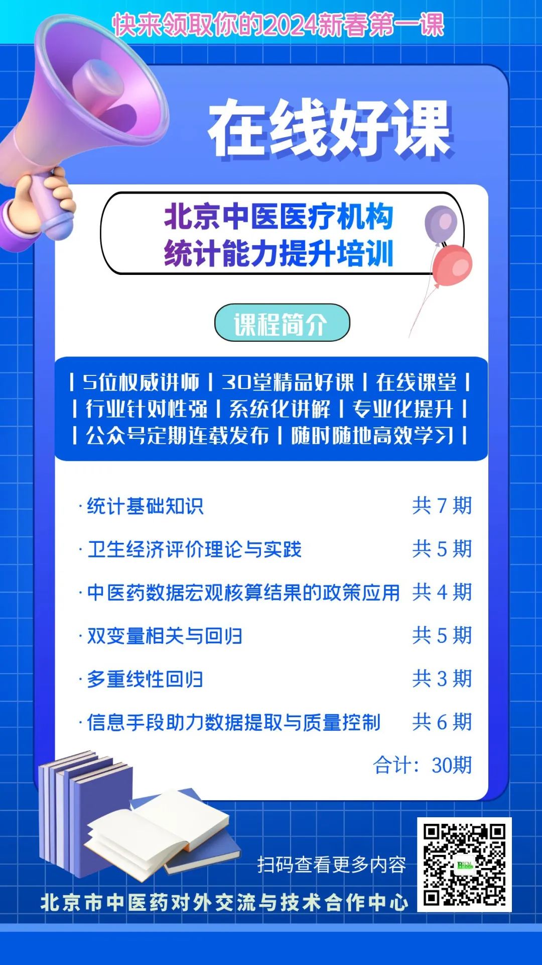 为提高中医药综合统计技术水平,加大统计学专业知识普及,为高质量提报中医药综合统计数据打下良好基础,北京市中医药对外交流与技术合作中心携手多名权威专家共同录制统计能力提升课程。快来领取你的2024龙年新春第一课。