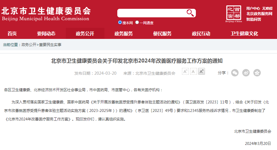 为深入贯彻落实国家卫生健康委、国家中医药局《关于开展改善就医感受提升患者体验主题活动的通知》(国卫医政发〔2023〕11号),结合《关于印发〈北京市改善就医感受提升患者体验主题活动实施方案(2023-2025年)〉的通知》(京卫医〔2023〕49号)要求,制定2024年改善医疗服务工作方案。