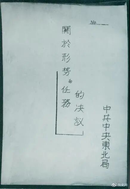 1946年7月,中共中央东北局通过了由陈云起草的《关于形势与任务的决议》,确立了创建根据地与进行长期艰苦战争的方针。该决议经中共中央修改和批准后,于8月12日正式发出。图为决议的翻印本。