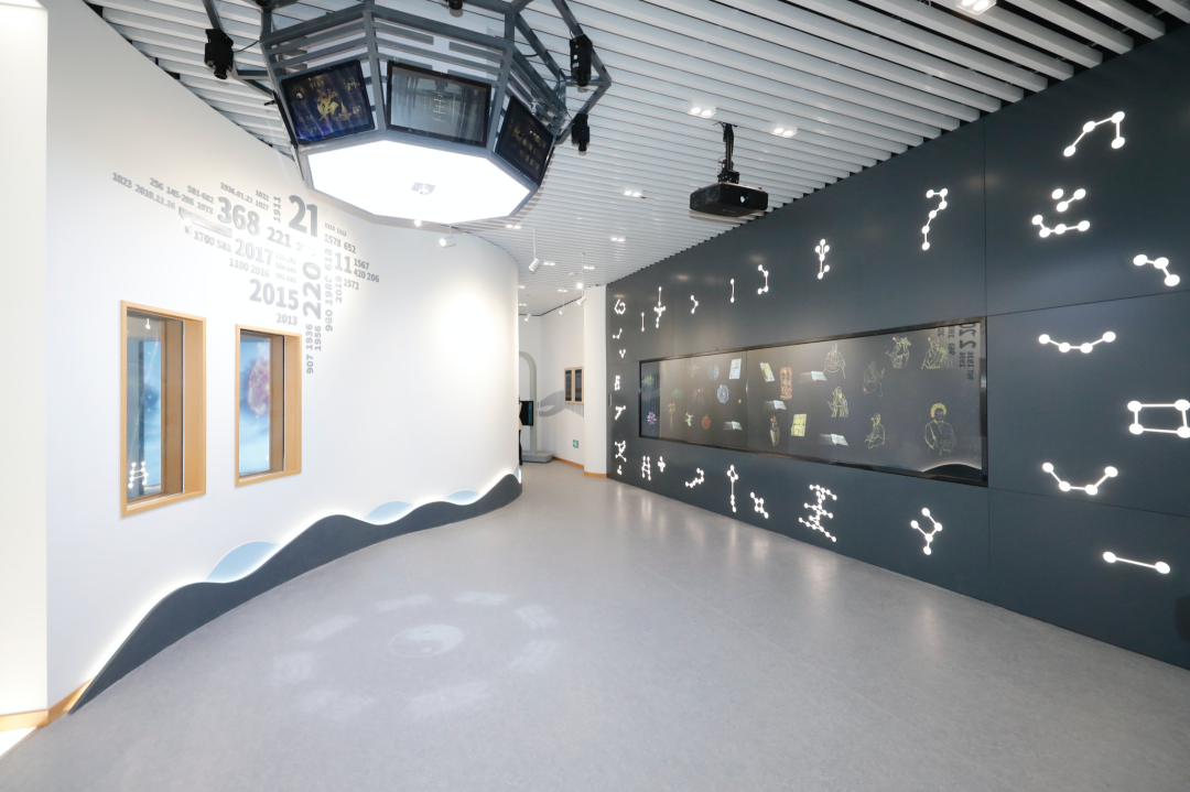 展区的“10秒探寻”板块展示了经络可视化滑轨屏与四诊仪。通过滑轨屏呈现的3D可视化经络图像,在10秒内可了解某一个穴位、某一条经络背后的奥秘。四诊仪将中医舌诊、面诊、脉诊、问诊整合在一起,提供数字化中医诊断信息。“10秒结缘”板块以“盲盒”的形式展示中医药主题的文创产品。“八卦多面屏”以8块屏幕分别呈现《易经》八卦,并于地板投影出太极八卦图,屏幕上太极八卦图旋转不停,象征不断发展的世界与生命的生生不息。“望而知之屏”上的“二十八宿”代表着中医“天人相应”的基本理念。“天人合一”体验屏为参观者带来“四季变幻”“云游北京”“功夫打卡”三个互动式体验场景,传递了中医药文化的深刻内涵。“药食同源墙”展现了一幅生活化的健康阴阳图。此外,“中医药高光时刻”板块记录了中医药发展的光辉历史。