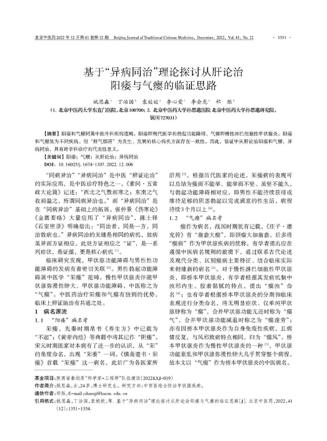 [6]姚思淼,丁治国,袁姣姣,等.基于“异病同治”理论探讨从肝论治阳痿与气瘿的临证思路[J].北京中医药,2022,41(12):1351-1354.