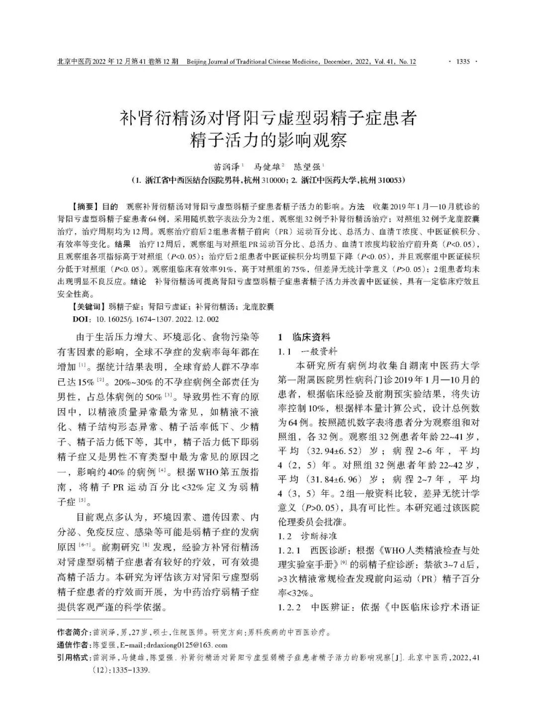 [2]苗润泽,马健雄,陈望强.补肾衍精汤对肾阳亏虚型弱精子症患者精子活力的影响观察[J].北京中医药,2022,41(12):1335-1339.