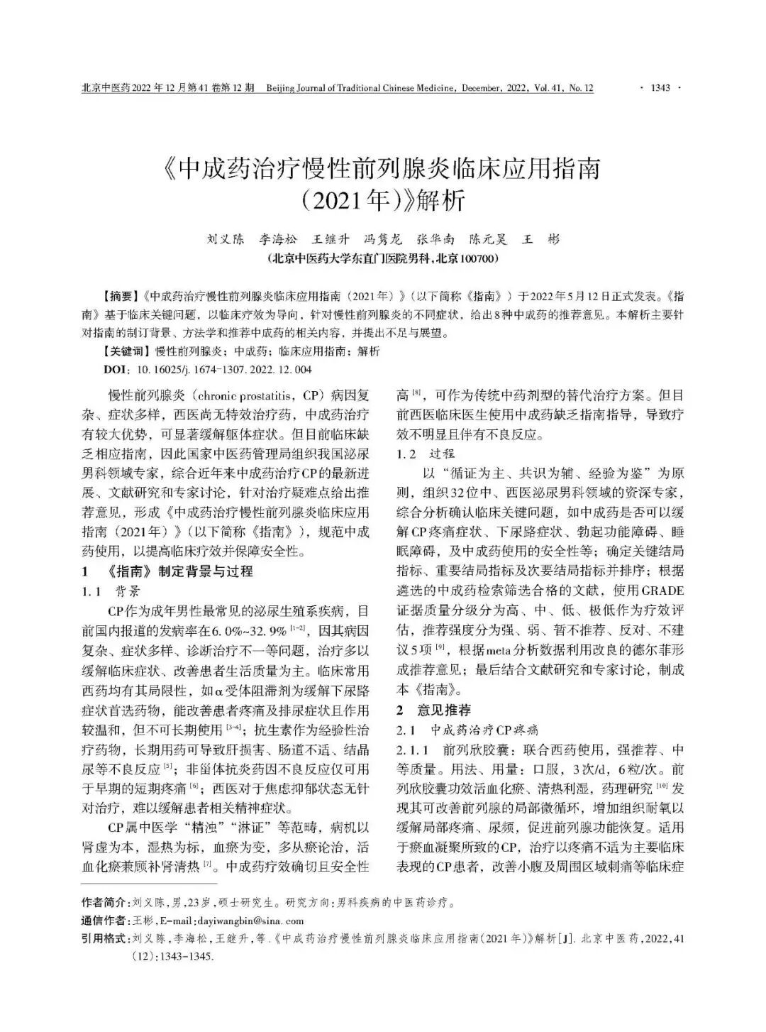 [4]刘义陈,李海松,王继升,等.《中成药治疗慢性前列腺炎临床应用指南(2021年)》解析[J].北京中医药,2022,41(12):1343-1345.