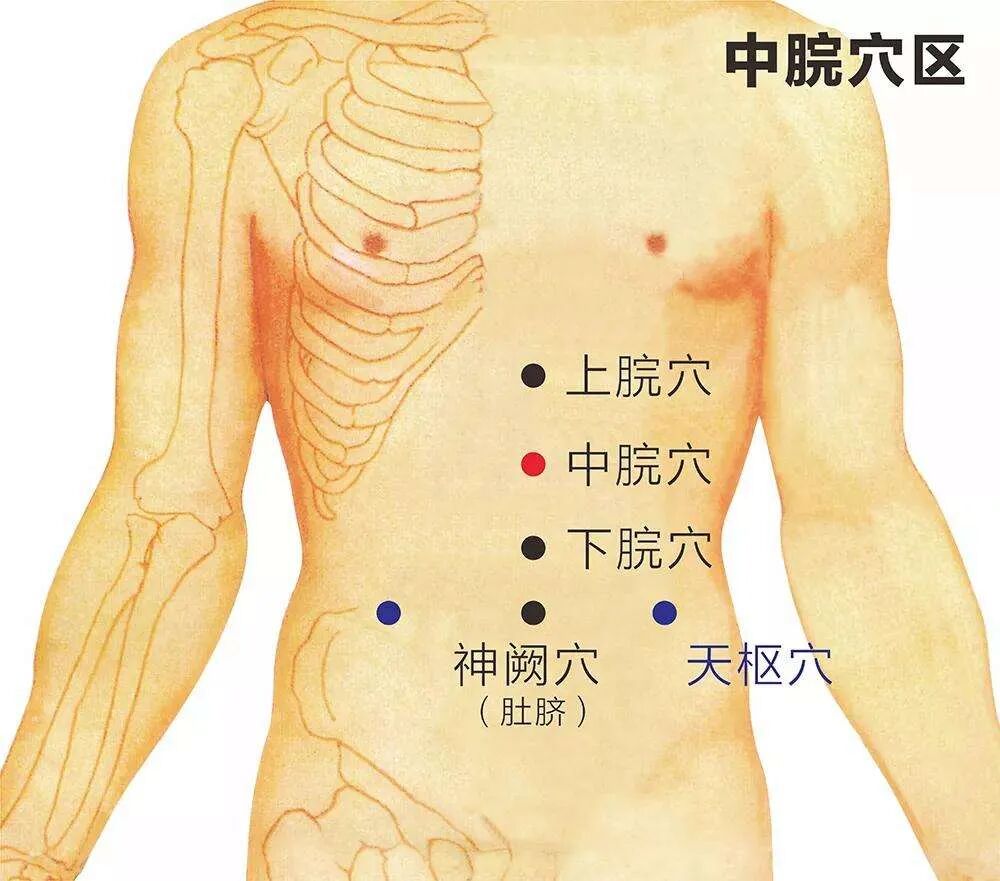 中脘、天枢位于腹部,腿上的足三里穴可调节腹部病症、三阴交可调理肝、脾、肾三经气血,三穴配合通调腹部气机而缓解腹痛。对于寒积腹痛可加神阙、关元温补脾肾、温中散寒;对于阳虚腹痛可加脾俞补益脾阳。