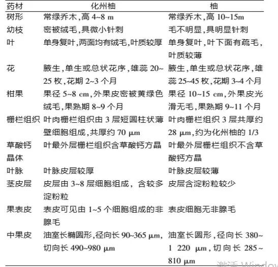 从上表可以看出植物形态方面:化州柚幼枝、叶、果都密披绒毛,柚果皮光滑无毛;显微结构:化州柚栅栏组织是柚的3倍,化州柚含草酸钙而柚没有,化州柚叶脉较厚。
