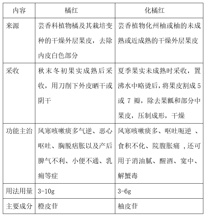 从以上比较可以看出,橘红和化橘红的来源不同,橘红和陈皮都是来源于芸香科植物橘及其栽培变种的干燥外层果皮。不去内皮者为陈皮,去除内皮白色部分为橘红。橘红和中理胃药则留白,下气消痰药则去白。橘红和化橘红所含的主要成份也不同。