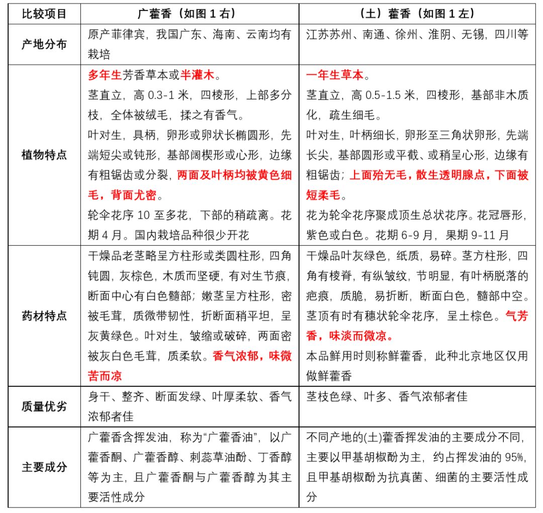 广藿香与(土)藿香虽然都属于唇形科植物,是近亲。但是他们在原产地、原植物及药材性状、质量、化学成分等方面仍存在较大的差异,具体如下表: