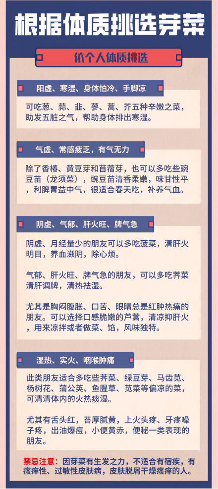 提到“发”就想到刚刚发芽的时令芽菜了,以生发之物补生发之能量。当然,根据不同情况体质,适宜的种类也不同,我们应根据自己的体质来挑选: